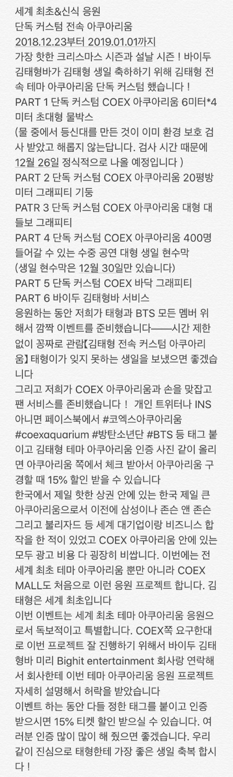 바이드ㅜ는 사람 1명이 하는거야 아님 단체야 ......? 이번에 태형이 생일 서포트 스케일 다 개쩔어ㅋㅋㅋㅋㅋㅋㅋㅋㅋㅋㅋㅋㅋㅋㅋㅋㅋㅋㅋㅋㅋㅋ 신박하고 대단하고 .. 세계최초 코엑스 아쿠아리움 단독 커스텀.. 빅힛한테 허락맡은거면 태형이도 알겠지 ㅠㅠㅠㅠㅠㅠㅠㅠㅠㅠㅠㅠㅠㅠㅠ 크 행복하다