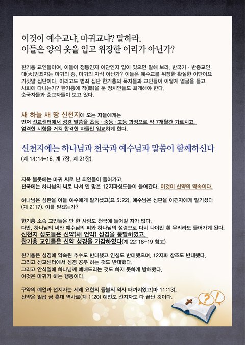 새 하늘 새 땅 곧 신천지예수교회는, 예수교가 아닌 칼빈 장로교 중심의 한국기독교총연합회(한기총)의 불법적 만행에 대해 규탄한다. 진심으로 회개하고 다시 나라.