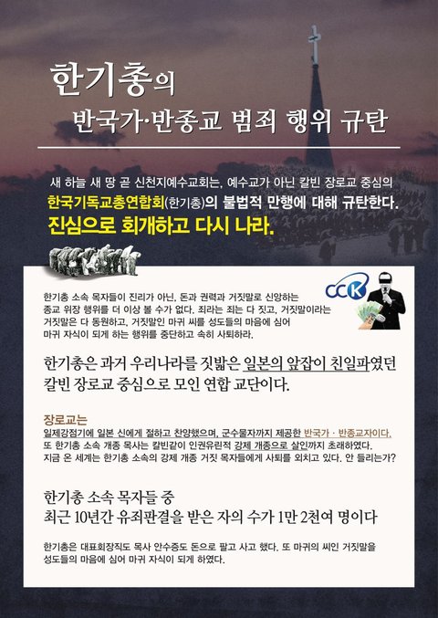 새 하늘 새 땅 곧 신천지예수교회는, 예수교가 아닌 칼빈 장로교 중심의 한국기독교총연합회(한기총)의 불법적 만행에 대해 규탄한다. 진심으로 회개하고 다시 나라.