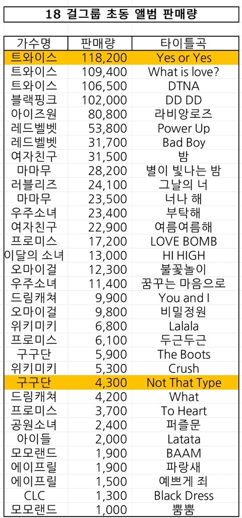 아이즈원의 데뷔 4주차 가온지수와 18년 걸그룹 초동 음반 판매량 표인데