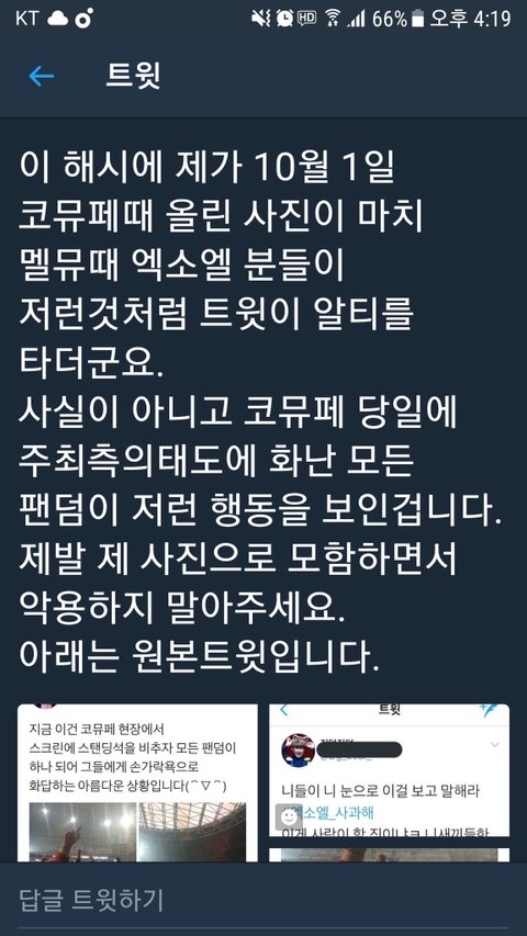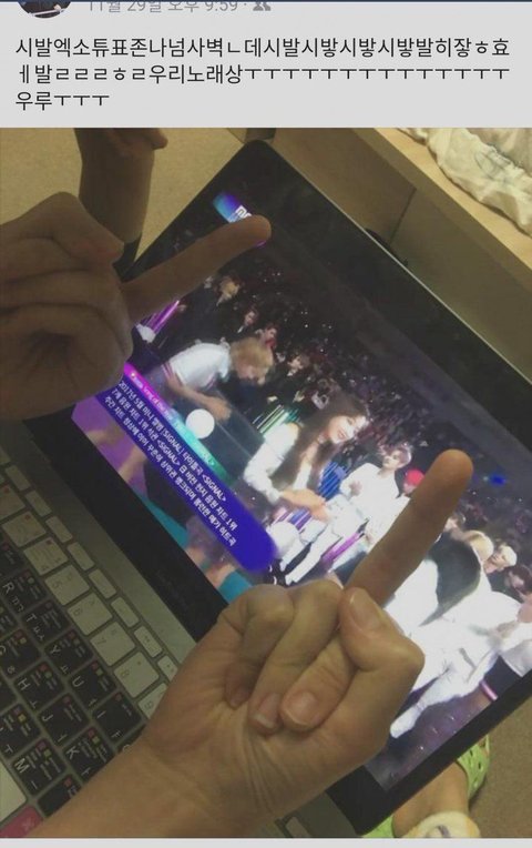 글쓴년아 양심 있으면 글 내려 니 같은 애들 때문에 오해 생겨서 더 욕 먹는거 모르냐? 반박짤 봤으면 니가 쓴 글이 사실 아니라는 거 아는데도 그냥 글 놔둔다고? 너는 지금 그냥 엑소랑 엑소엘 욕 먹이고 싶은 거 아니야? 너가 하는 행동도 개념없고 옳은 행도 아니라는 거 알기 바라고, 너도 조만간 실생활에서 이렇게 당하는 날 올꺼다. 그 때가서 억울해서 눈물 흘리지 말고 니 손가락을 원망해라