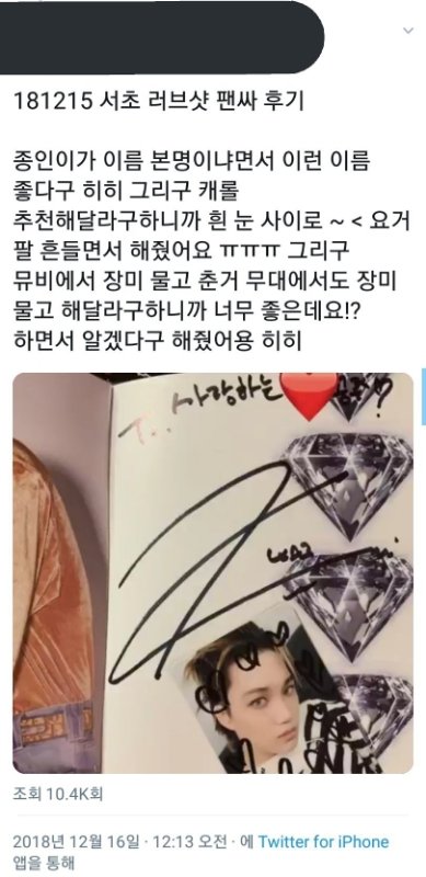 와.. 저 팬 부러워ㅠㅠ 카이 항상 사려깊고 팬사랑 쩌는거 오늘 또 느꼈댜ㅠㅜ