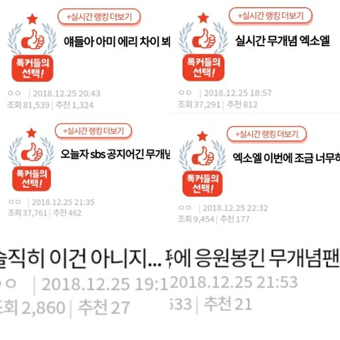 지금 톡선에 엑소엘 응원봉 킨 글이 두 개씩이나 있는데 추천박은사람들이랑 댓 싸지른 사람들 다 양심 있냐?ㅋㅋㅋㅋㅋ