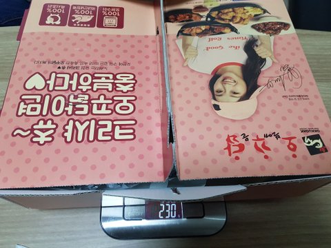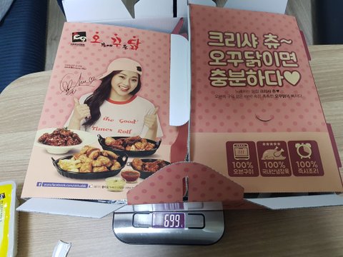 구운 치킨이라 부피가 적어보이나, 내 착각인가 싶어서 주방 저울을 가져와서 재봄.먹기전에 안에 치킨무랑 콜라 빼내고 박스째 잰 무게에서 다 먹고난 뒤 박스 무게를 빼면 치킨무게잖아?