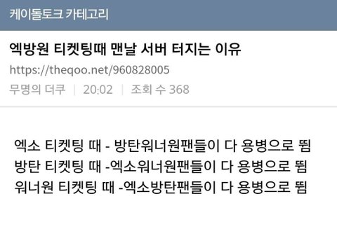엑소 방탄소년단 워너원 티켓팅때 맨날 서버 터지는 이유.txtㅇㄱㄹㅇㅋㅋㅋㅋㅋㅋㅋㅋㅋㅋㅋㅋㅋㅋㅋ