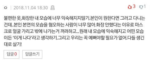 난 이거. 내가 저 글을 볼 때 되게 힘들었던 시기였거든... 뭘해도 자존감 뚝뚝이고 무조건 밖에 나갈 때 화장은 꼭 하고 나가고 그래서 피부도 더 안 좋아지고 여튼 진짜 파블로프의 개?랑 비슷한 상황이었는데 저 댓글보고 뭔가 순간 쿵- 하는 느낌 들었었어ㅋㅋ 물론 난 지금도 여전히 밖에 나갈 때 화장을 하지만 전처럼 막 그렇게 강박적으로 하지는 않는 거 같아! 진짜로 있는 그대로의 나에게 익숙해졌다고나 할까..?