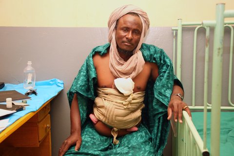 2017년 12월, 말리 안손고: 마하마도 아가이리 (40)가 생후 2일된 자신의 아이를 포대기에 싸서 안고 있다. 부인은 국경없는의사회가 지원하는 병원에서 분만 중 수술을 받아 회복중이다. 보통 이 지역에서는 남성이 아이를 안거나 엎고 다니지 않기 때문에 이는 매우 보기 드문 장면이다. ⓒSEYDOU CAMARA/MSF