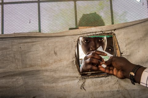 2017년 12월, 남수단 올드 판각 (Old Fangak): 약사가 병원 약국 안에 설치한 천막에 난 작은 구멍을 통해 환자에게 처방약을 건네고 있다. ⓒFREDERIC NOY/COSMOS
