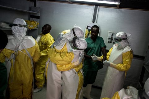 2018년 11월 콩고민주공화국 부니아: 의료진이 개인 보호 장비 착용후 신설된 에볼라 치료 센터의 위험 지역에 들어가기 전 포옹하고 있다. ⓒJOHN WESSELS