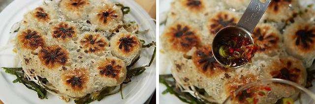 7. 바삭하게 잘 구워지면 구운 채소 위에 만두를 올린 후 양념간장을 뿌린다.