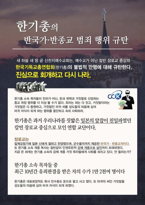 한기총은 과거 우리나라를 짓밟은 일본의 앞잡이 친일파였던 칼빈 장로교 중심으로 모인 연합 교단이다. 장로교는 일제강점기에 일본 신에게 절하고 찬양했으며, 군수물자까지 제공한 반국가·반종교자이다. 또 한기총 소속 개종 목사는 칼빈같이 인권유린적 강제 개종으로 살인까지 초래하였다. 지금 온 세계는 한기총 소속의 강제 개종 거짓 목자들에게 사퇴를 외치고 있다. 안 들리는가?
