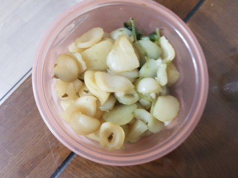 체에 걸러 보니 15분을 끓인 관자가 아직 말갛게 보이는게 감자 수제비 같습니다. 식감도 관자와 수제비에 중간쯤되고 전혀 질기지 않고 국물도 우러나지 않네요. 미역 4인분에 키조개관자 8개를 넣었는데 국물엔 조개맛이 전혀 안납니다.