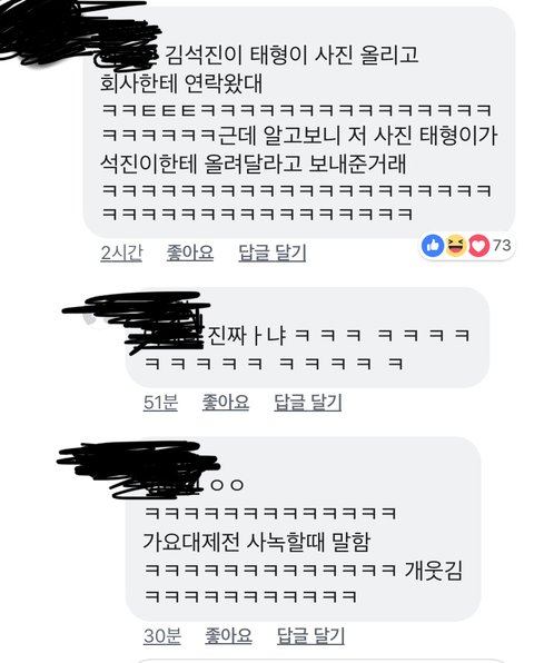 ㅋㅋㅋㅋㅋㅋㅋㅋㅋㅋㅋㅋㅋㅋㅋㅋㅋㅋㅋ 석진이가 자기 억울하다고 그랬대 ㅋㅋㅋㅋ 혹시 몰라서 성함은 가렸어! 둘 다 귀엽다 증말 ㅋㅋㅋㅋㅋㅋ