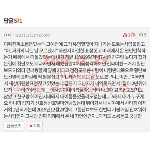 나는 자주 다니는 횡단보도 앞에서 한창 그때 유행했었던 장난인 미래에서 온 연인 혹은 운명인척 아련한 말을 하는 (ㅋㅋㅋ;;) 장난을 어떤 모르는 남자에게 쳐봤고 그남자가 나한테 "알아 2년뒤에 보자 ㅇㅇ아 "하며 내이름을 말했는데 그게 너무너무 신기해서 댓달았다가 수많은 분들이 후기를 기다리는 바람에 너무 춥지만 어제 한번 가봤어 그 횡단보도에