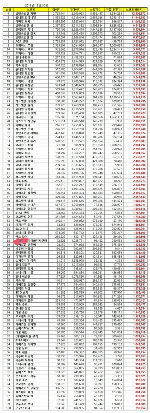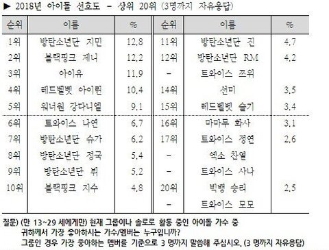 트와이스 방탄 워너원 블랙핑크는 대세 그룹 답게 전원 이름이 상위권에 올라갔고 엑소는 시우민 제외한 전원이 이름을 올림