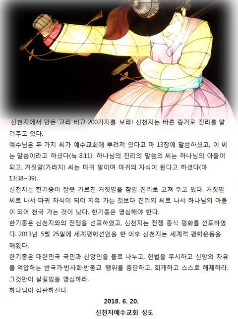 전통인 한기총이 낡고 부패하여 갖은 죄를 지으면서, 하나님께서 약속하신 예언의 말씀(신약, 계시록)을 200여 가지나 왜곡하고 거짓말을 지어 성도들에게 먹였고, 신천지가 가르치는 정통 계시 말씀을 사이비 이단으로 규정하였습니다.