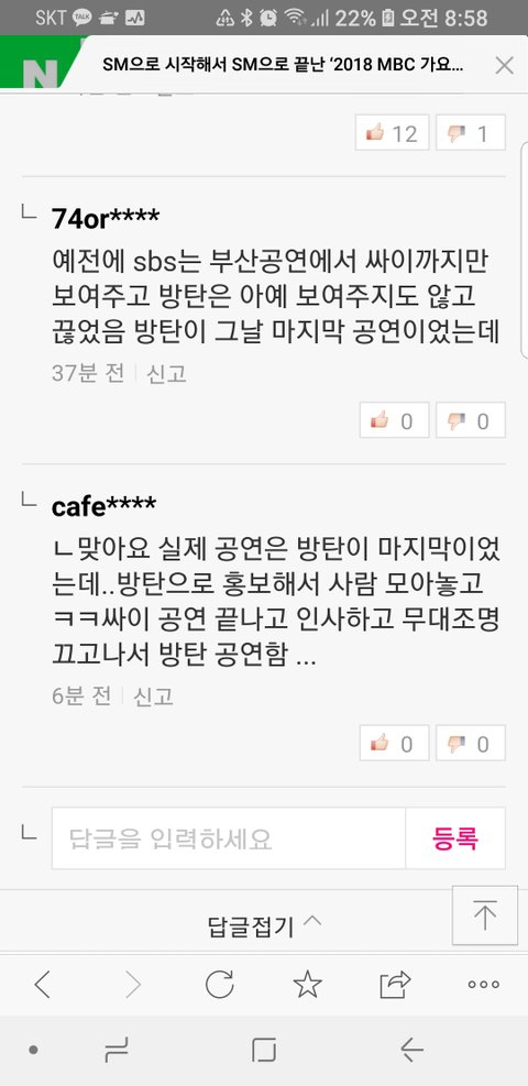 웅ㅋㅋㅋㅋㅋㅋㅋ 진짜 빡쳤음 나 나중에 직캠보고 우리애들 나온거 알았잖아 아니ㅋㅋㅋ 조카 웃긴게 중계를 ㅆㅇ님까지만 하는것도 어이없는데 바로 다음에 나오는 가수도 있는데 그전에 중계끊는다는 이유로 꽃가루 파티한거ㅋㅋㅋ 진짜 속상했다