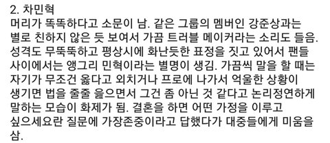 의외로 차교수가 아이돌이라면 인기 제일 많을 것 같지 않냐...그냥 오래된 골수팬들은 차민혁 매력에 빠질 것 같아 앵그리 민혁 대체 무엇 ㅋㅋㅋㅋ