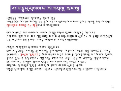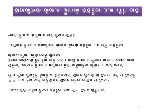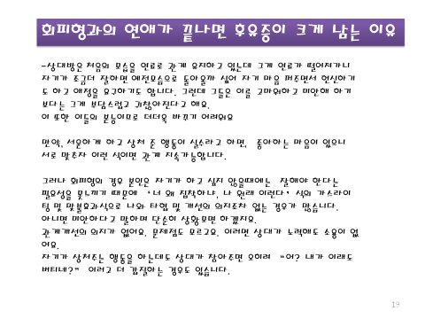 여기서 상대방이 멘탈이 약할 경우 회피형들이 주로 하는 말들 " 너는 왜 불만이 많냐 왤케 애정에 연락에 집착하냐 나도 지쳤다 등등"의 가스라이팅에 상대방들은 자기가 정말 잘못한줄 알고 자책 하는 경우도 많음. 물론 지나친 애정요구와 집착은 피곤한 것인데 위의 경우 회피형들이 애정을 주다가 갑자기 끊은데에 따른 결과 임.