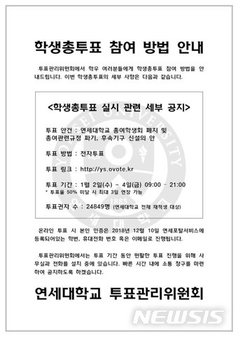 연대 총학생회 비상대책위원회는 페이스북을 통해 이날 오전 9시부터 4일 오후 9시까지 총여 폐지 및 총여 관련 규정 파기, 후속기구 신설의 안에 대한 학생 총투표를 실시한다고 밝혔다.