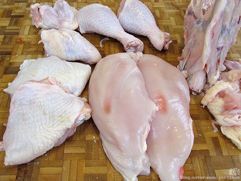 허벅지와 다리를 분리하고, 날개는 어깨 부분에서 잘라냅니다.