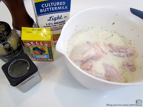 흔히들 닭고기 잡내를 제거하기 위해 우유를 사용하는데, 버터밀크가 고기 재워두는 용도로는 좀 더 좋은 듯 합니다. 우유에서 버터를 만들고 남은 유청을 발효시킨 게 버터밀크인데, 약간은 시큼한 요거트 비슷한 느낌입니다.