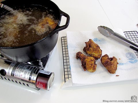 밀가루를 뒤집어 쓴 닭고기는 170도 (화씨 350도)로 가열한 기름에 튀겨줍니다.