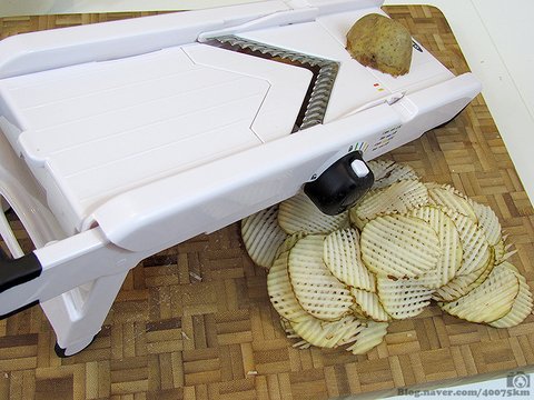 이 칼날을 지그재그 형태의 크링클 컷 칼날로 바꿔 준 다음 감자를 45도 각도로 방향 바꿔가며 슬라이스 하면 끝입니다.