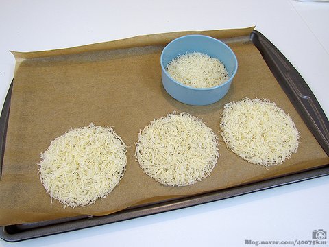 정식 명칭은 치즈 튀일인데, 파마산 치즈를 강판에 갈고 틀을 이용해서 모양 맞춰 팬 위에 얇게 깔아 준 다음 오븐에 바삭하게 구워내기만 하면 됩니다.