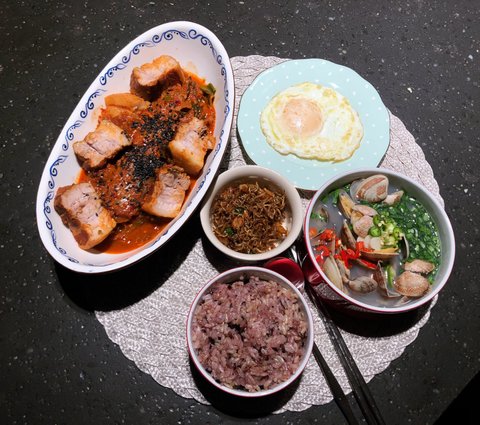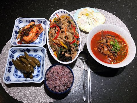 돼지고기김치찜 바지락탕 잔멸치볶음 계란반숙