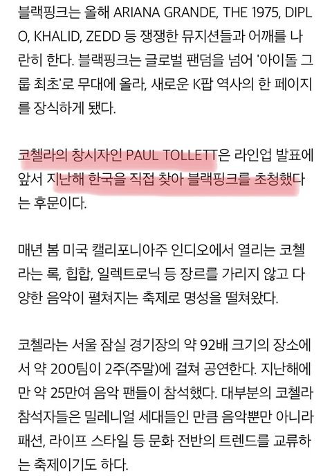 코첼라 안가보신 분들이 대부분 댓글을 쓰긴 거 같네요...저는 엘에이 현지인이고 2014년도부터 코첼라 다녓는데....코첼라는 빌보드차트나 이런거에 연연하지 않고 그냥 느낌대로 넣는 식입니당 어차피 가면 다 같이 캔디나 몰리 먹고 약빤 상태로 놀아서..그리고 요즘 케이팝이 아시아인들이 많이 듣다보니 많이 넣어줘요! 사실 인지도도 낮고 노래도 못알아먹어서 막상 현장에서는 호응이 매우 적지만 그래도 아시아인들은 많이들 즐겨서 넣어줍니당ㅋㅋㅋㅋㅋㅋㅋㅋㅋㅋㅋㅋ다들 제대로 알고 경험해고 얘기를 하셔야지 무작정 까시네요 근데 블핑이랑 혁오 걱정되는 건 사실ㅋㅋㅋㅋㅋㅋㅋㅋㅋㅋㅋㅋㅋ아오 현장에서 내가 다 쪽팔릴까바 무섭다...그리고 초청되었다고 해서 엄청 영광으로 아는데 여기애들은 그렇게까지 생각하지 않아요 절대ㅋㅋㅋㅋ한국에서만 자랑스러워하지 뭐...