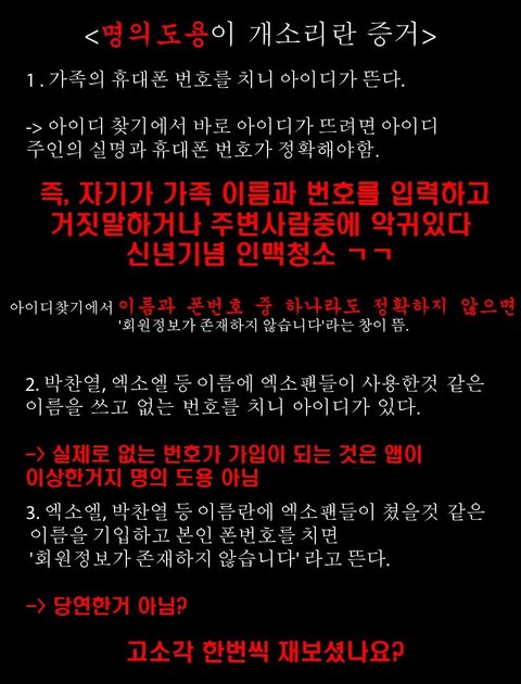 ㅋㅋㅋㅋㅋㅋㅋㅋㅋㅋㅋㅋㅋㅋㅋㅋ 이거 누가 작성함? 이거 작성한 사람 생각 너무 짧은거 아니냐? 지금 명의도용으로 고소당하냐 안당하냐가 중요한게 아닌거 모르는건가? 명의 도용만 문제임? 명의도용이 아니더라도 개인정보를 이용해서 불법적인 루트에 사용했다는 건 생각 안해본건가? ㅋㅋㅋㅋㅋㅋ