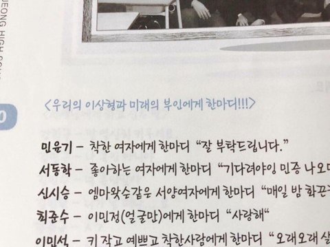 고딩 때 졸업하면서 반에 돌아가면서 롤링페이퍼도 쓰고 그런걸 했나 봄. 이상형과 미래 부인에게 한마디 맨 위에 민윤기가 슈가임. 민윤기-착한 여자에게 한마디 "잘 부탁드립니다"