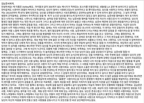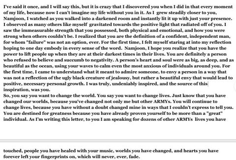 안녕 이삐들!!난 트위터에서 주로 서식하는 덕후인데, 외랑둥이가 남준이에게 쓴 편지를 들고 왔어. 정말 공감되고 감동적인 이야기여서 공유하고 싶어서ㅎㅎ 내가 외랑둥이들을 많이 팔로우해놨는데, 가끔 왜 탄이들은 좋아하느냐는 트윗이 올라오거든. 그래서 답멘들을 보면, 물론 잘생겨서, 핫하니까 이런 이유들도 있지만 전반적으로 우리 탄이들을 덕질하는 이유가 한국 아미와 비슷한 거 같고, 이게 그 양상을 잘 보여주는 것 같아서 들고왔어 번역본은 원본 밑에!!