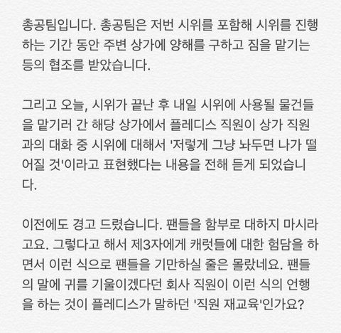 여기서 뭘 어떻게 더 해야하는걸까 지켜봐달라며 직원들 인성교육 똑바로 하겠다며 대체 똑바로 하는게 뭐야? 팬들이 등 돌리는게 제일 무서운거라는걸 왜 모르지? 진짜 너무 속상하다ㅠㅜ 우리 어떡해?