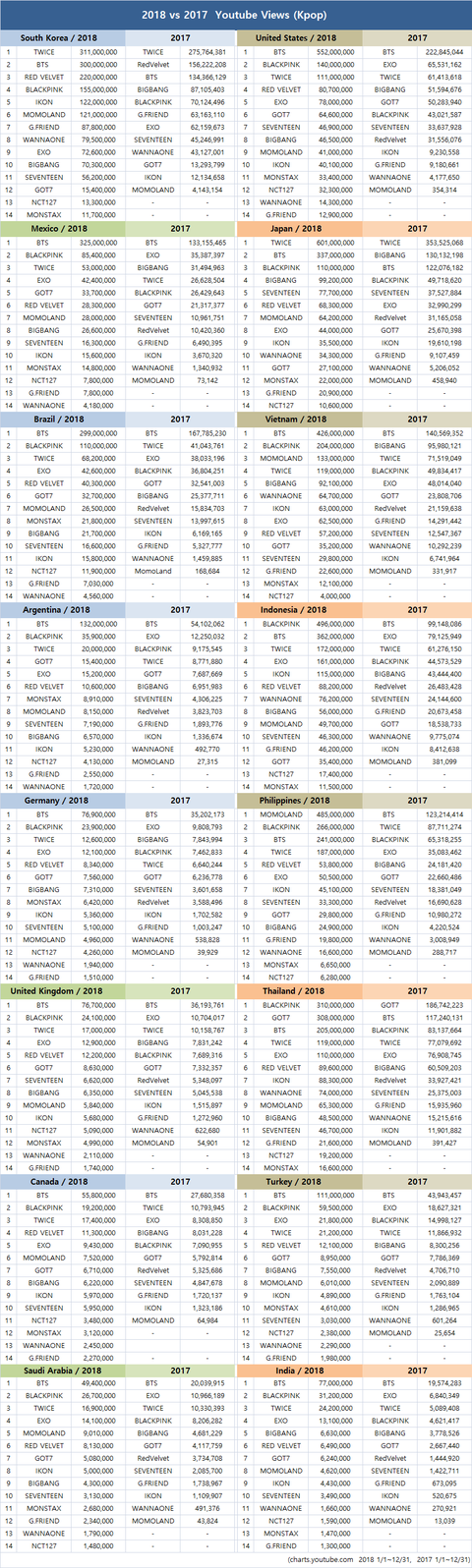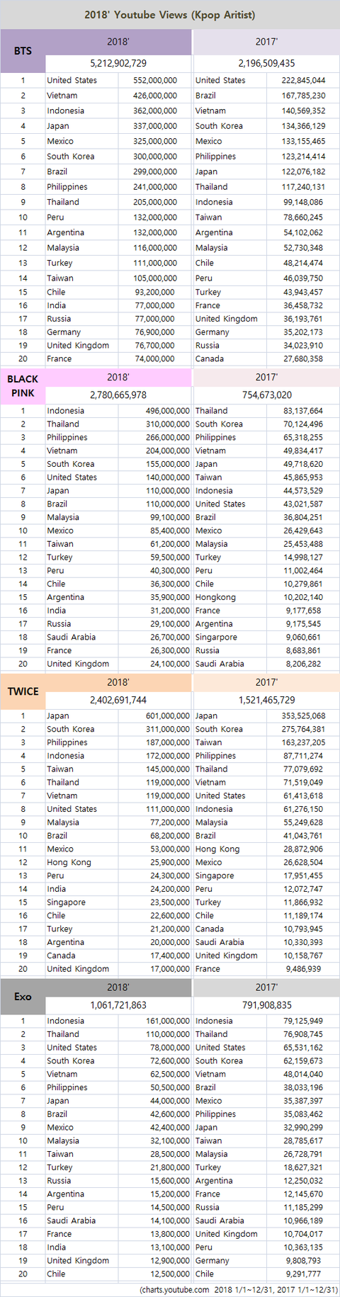 방탄, 블핑, 트와이스, 엑소 - TOP20 조회수 국가