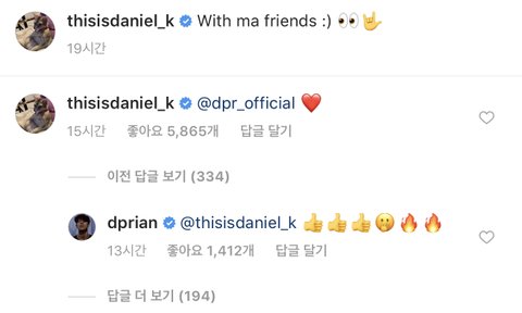 강다니엘이 DPR LIVE-Please라는 곡에 안무짜서 영상올렸는데 DPR오피셜이 하트누르고 댓글남기고