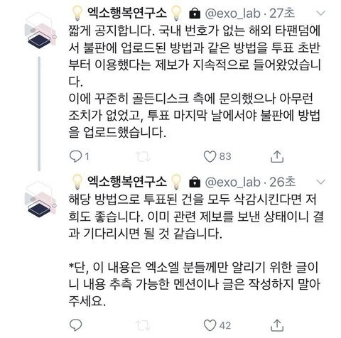 이거 엑소엘은 항상 불법 저질렀단 고백 아냐? 내용이 그렇잖아. 원래 있던 관행 같은 거다. 그 관행이란 거 자기들 해왔으니 이번에도 했다는 소리잖아. 자기들이 해왔으니 이번에도 당연하게 생각한 거고. 그전에 나온 말들도 계속 다른 그룹팬들도 했다인데 전수조사하니 168표. 그런데 그 표라는 것도 사실 알고 보면 저쪽이 불법 저지르며 잘못 누른 표일 가능성이 높고. 트위터 뜬 거 보니 실제로 서두르다 타그룹 누른 표들 봤다. 속상하다. 서두르지 말고 차근차근 눌러라란 말도 있고. 나도 투표하면서 화면 움직이는 바람에 타그룹 누른 적 몇 번 경험했고. 이거 사실 엑소엘의 불법투표에 대한 자기 고백으로 들리는 것은 나만인 건가? 만약 그런 거라면 이건 팀킬이네.