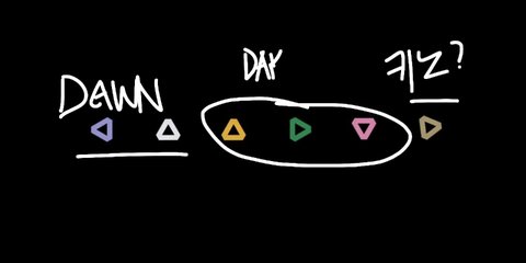 저번앨범 차례대로 노랑초록분홍(meet, follow,set the sun)이고 이번앨범이 전 내용이니깐 저 노랑 앞에 파랑 하양 로고가 이번 앨범이고 맨 끝은 특별하게 키노?로 나오거나 다음 앨범 세계관 이런거 아닐까