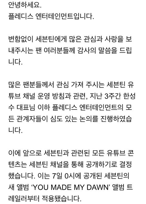 그 이후 올라온 첫 피드백 글은 플레디스 한성수 대표가 직접 올린 글이었는데, 결론은 " 유튜브 계정은 통합할 것이다 " 였음.