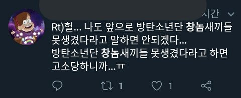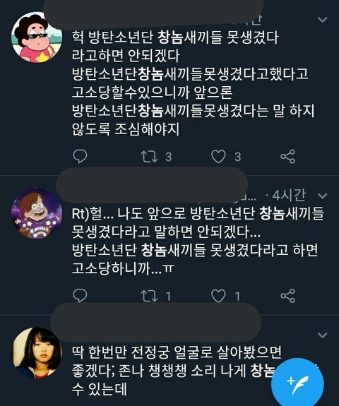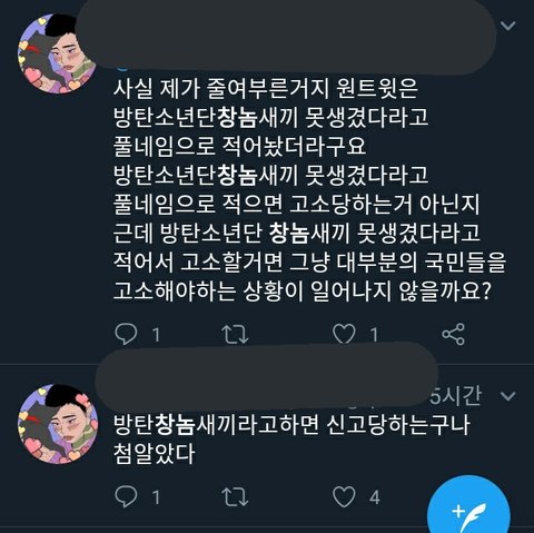 짹하는데 갑자기 ㅂㅌ 외모비하글 올라오길래 걔 탐라 들어갔다가 ㅊㄴ워딩 줄줄이 쓰고 있는 애들 보고 기겁함. 일단 난 이미 보내긴 했는데 여러번 보내면 ㅂㅎㅌ도 더 신경쓰지 않을까 해서ㅠㅠㅠㅠㅠ