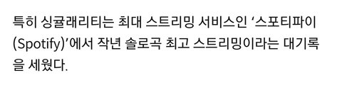 2018년 12월 29일 기준으로 스포티파이에서 뷔 싱귤래리티 스트리밍이 약 4680만이고 제니 솔로 스트리밍이 약 4710만 정도거든? 근데 작년 스포티파이 솔로곡 최고 스트리밍이 싱귤래리티야?