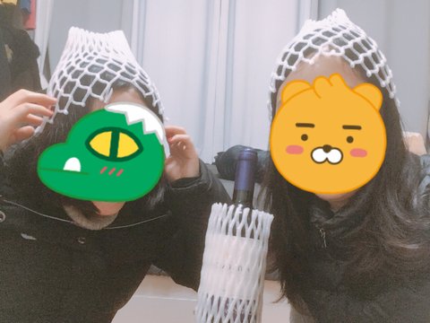 집에 와서 와인 감싸고 있던 거 머리에 쓰고 즐거워함