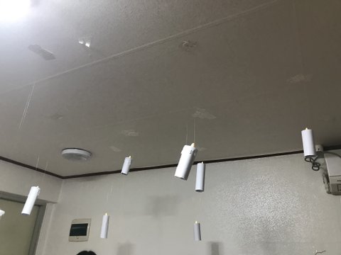 휴지심을 하얀종이로 감싸고, 그 위에 글루건을 쏴서 촛농 모양을 만들고, 바늘로 낚시줄 통과시켜서 묶고… 그걸 10개쯤 했음
