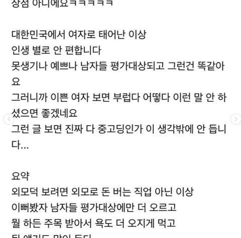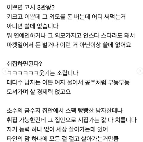 지인중에 진짜 제대로 예쁜사람 있는데 모르는 사람들의 친절은 진짜 많이 받는게 팩트라고 함 가게에 손님일때 회사나 학교 생활 초반에 진짜 편한건 맞는데 그 뒤가 문제라고 함 남자는 대부분 친절한데 어차피 나랑 안될여자라고 생각해서 반대로 괴롭히는 사람도 있고 쓰레기 예비범죄자들 관심도 한몸에 받아서 힘들대 집안좋고 학벌좋아서 주변 물이 좋은게 중요하댔음 여자들 얘기는 안해줌