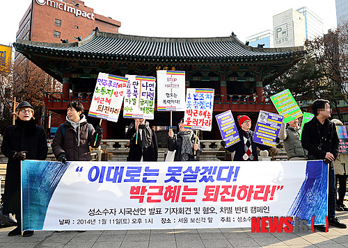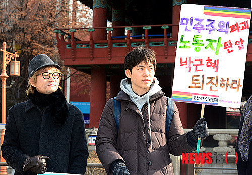 【서울=뉴시스】조성봉 기자 = 11일 오후 서울 종로구 보신각 앞에서 열린 박근혜 대통령 퇴진 성소수자 시국선언 기자회견에서 김조광수(왼쪽)와 김승환 커플이 박근혜 퇴진을 요구하는 피켓을 들고 있다. 2014.01.11.