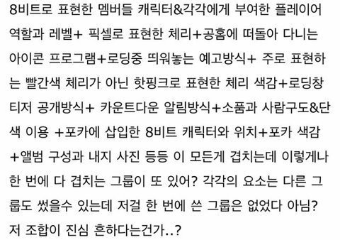 체리╋도트╋8bit╋캐릭터╋게임╋레트로╋아날로그 이런식의 컨셉 한 아이돌 누구 있는데 이게 아이돌판에 유행이라면 다 했겠지 근데 엔시티 이전에 한 아이돌이 없는데 갑자기 ㅊㄹㅂㄹ이 비슷한 컨셉을 가지고 왔자나ㅜ