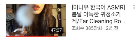 거의 asmr의 시초(?)인 분이야. 특히 미니유님은 귀청소 장인이라고 불릴 정도ㅠㅠㅠ(사실 내 생각이야..ㅎ) 그리고 asmr을 이 분 덕분에 알게됐어..ㅎ.ㅎ 이 분은 다른 분들에 비해 귀청소 영상이 많으신데 다 좋으니 취향껏 골라들으면 좋을 듯! 참고로 이 영상도 롤플!