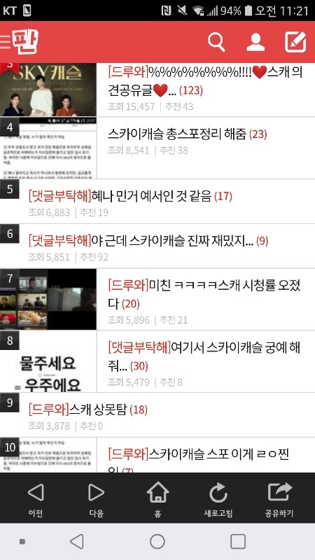 판에 10대 이야기 하는 친구들 모두가 스카이 캐슬 보는 것도 아닌데 이렇게 글이 많은 건 좀 심한 것 같애 얘들아 좀만 자제하자~~~