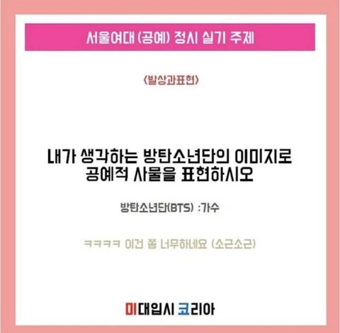 - 그외 이대, 대기업 입사 시험에도 이미 나왔고 심지어 kbs 공채시험에서는 방탄소년단이 출연한 미국 토크쇼 프로그램 4개를 주관식으로 적는 문제가 나왔다고 함. 부정하고 싶은사람도 있겠지만, 방탄은 언론사 시험에도 등장할 만큼 중요한 사회 이슈가 맞는 것 같음.